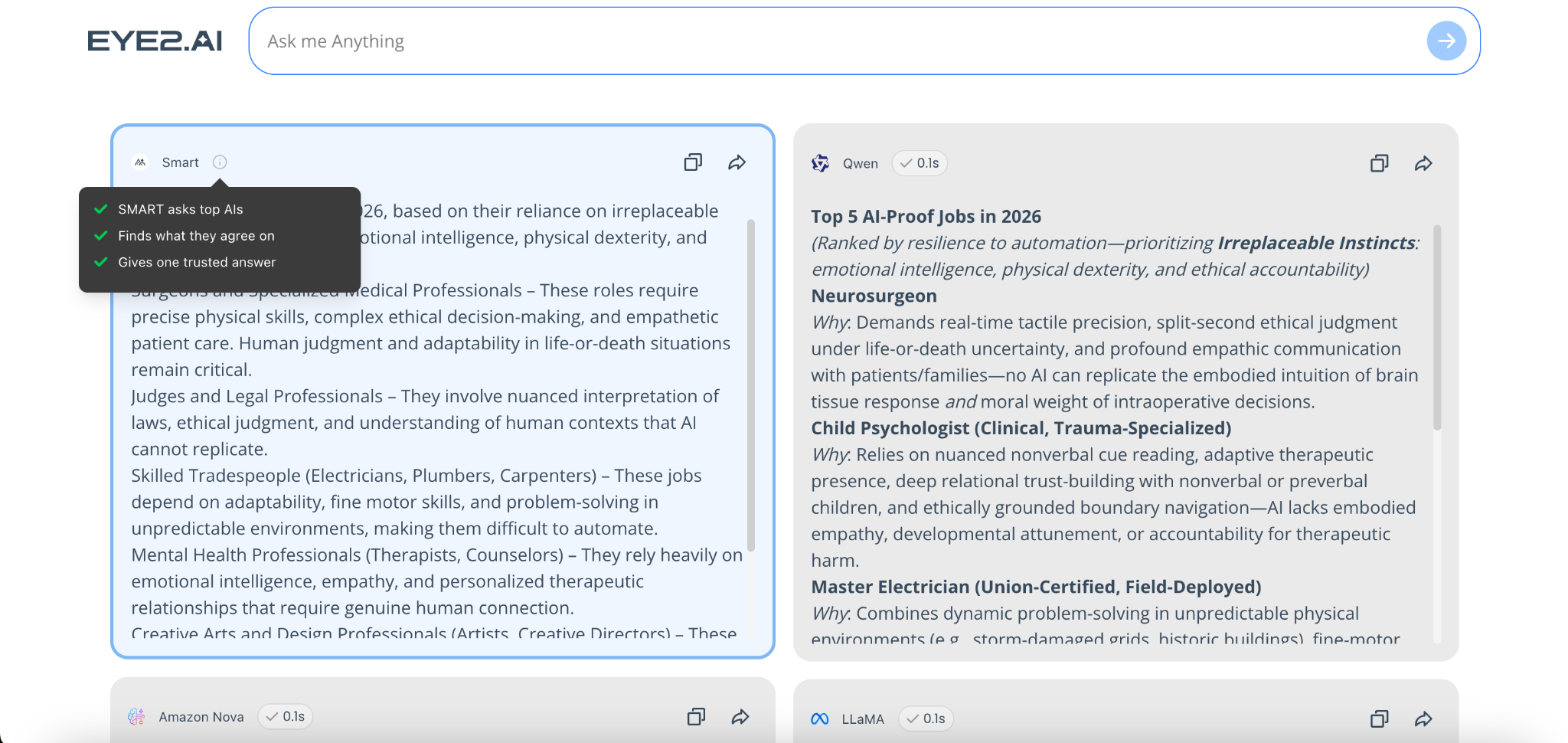SMART: For high-stakes queries, the SMART technology synthesizes only the points of agreement into one trusted answer, filtering out the "weird" or inaccurate results that a single bot might produce by taking into consideration the output that most of the AIs agree on.