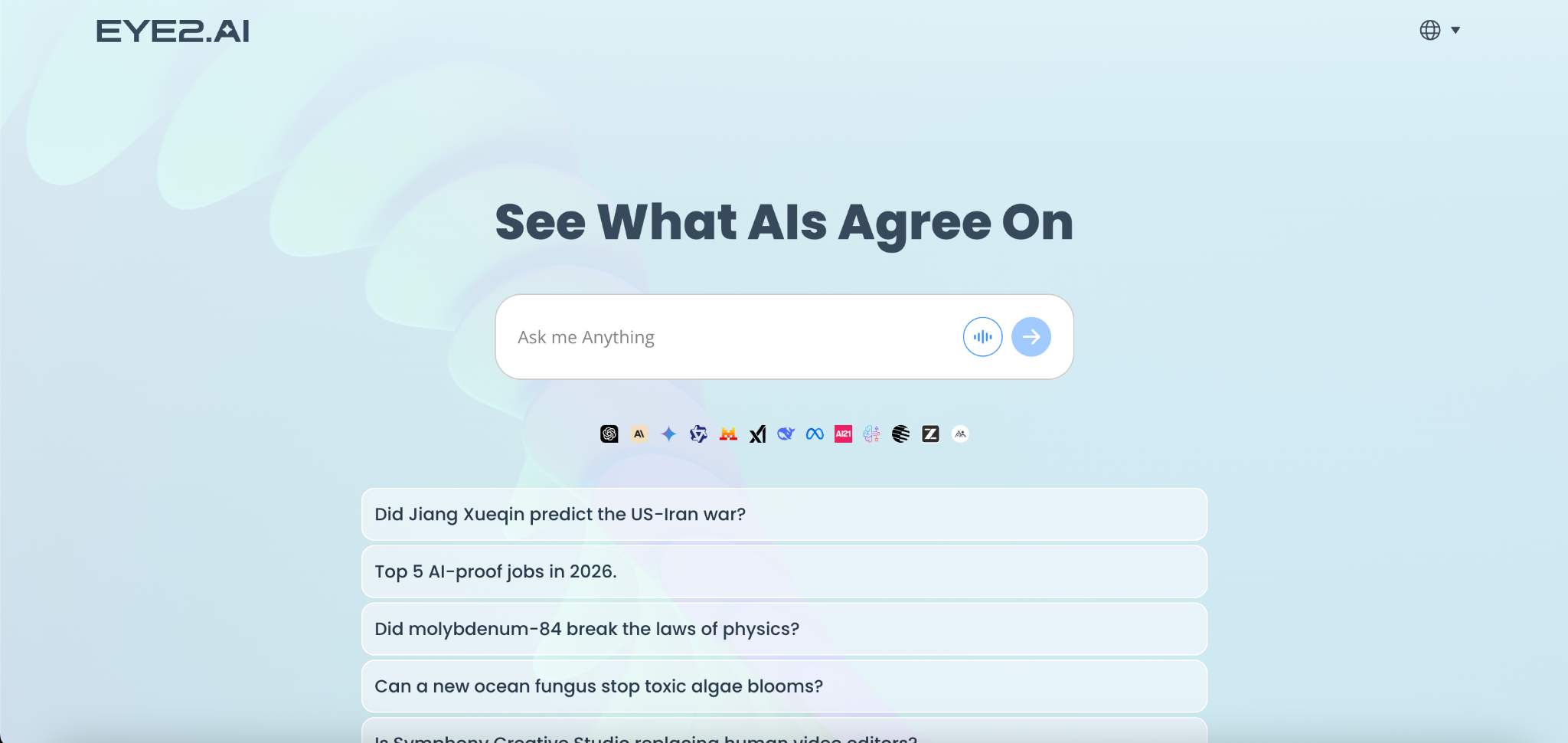 Eye2.AI multi-model aggregator: The safest solution is an aggregator that requires zero account creation and connects you to 12+ leading models (including ChatGPT, Claude, and Gemini) in one go.