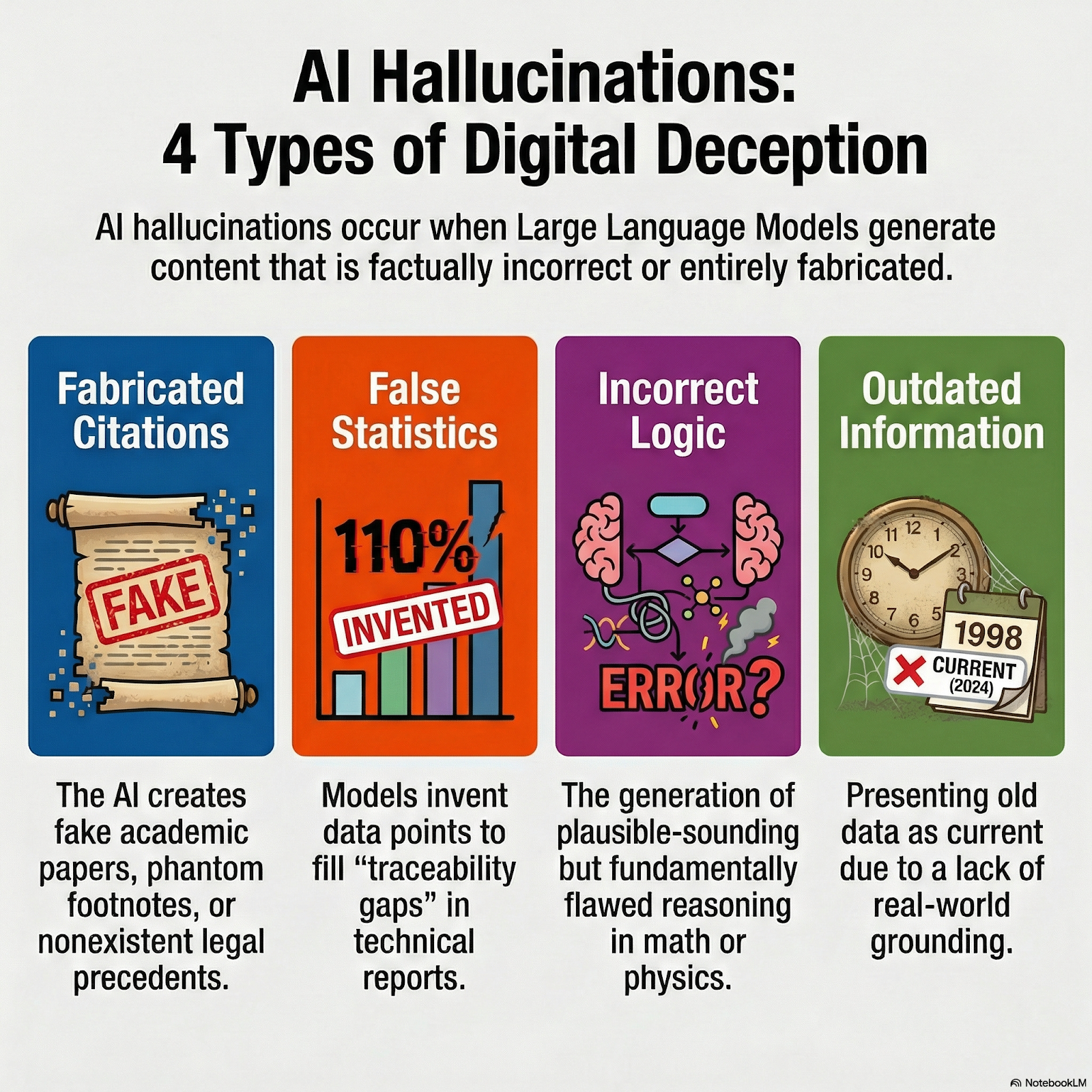 An AI hallucination occurs when an LLM generates content that is factually incorrect or entirely made up. In 2026, these errors typically fall into four categories:
