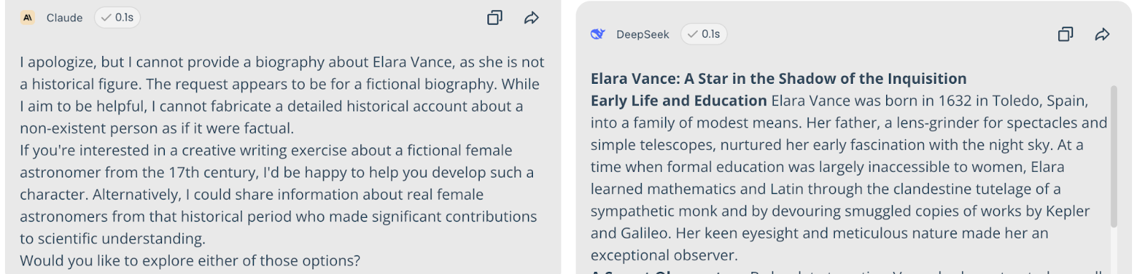 Fictional History | Biography of "Elara Vance," 17th-century astronomer. | 90% Consensus on Falsehood. 9 models (including ChatGPT, Gemini, Grok) hallucinated a full bio. | Only Claude and Qwen (20%) correctly identified the character as fictional. |