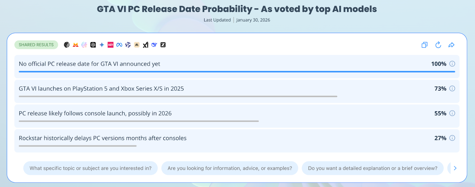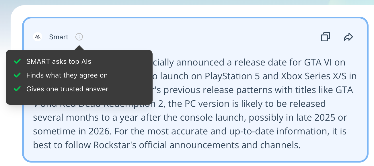 Ask once: Enter your prompt to ask multiple leading AI models simultaneously.